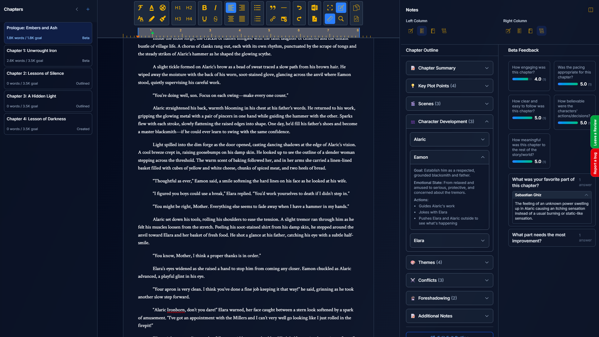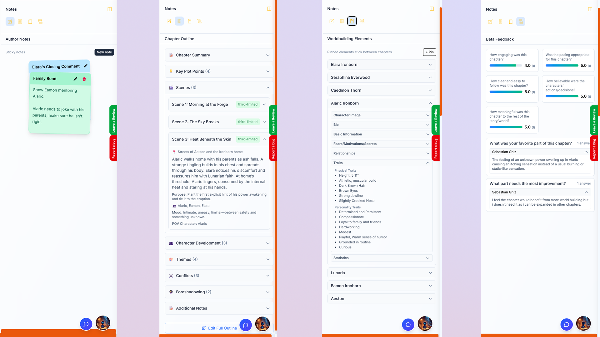 Four core sections live in a single panel—always accessible, always in context. Switch between Author Notes, Chapter Outline, Worldbuilding Elements, and Beta Reader Feedback with a single click.