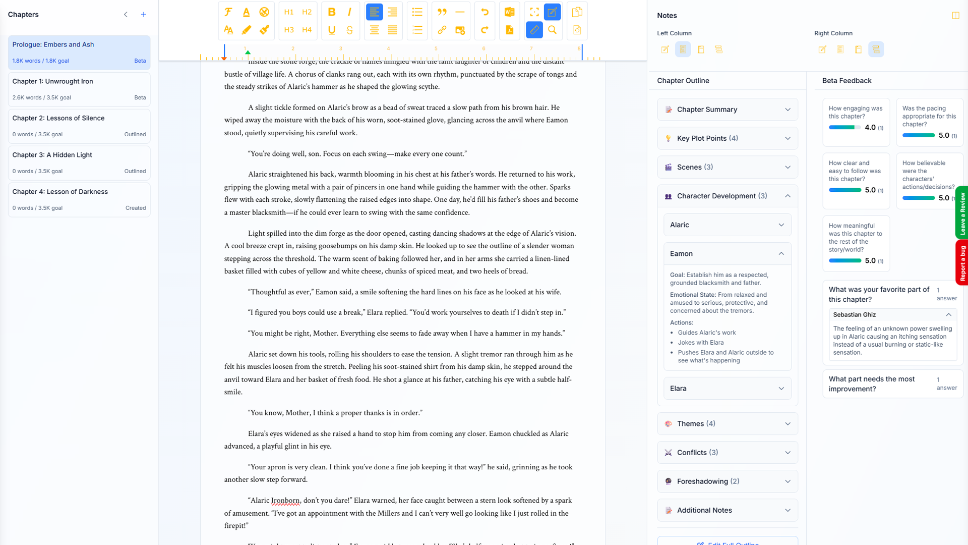 Writers who need outlines, world notes, and beta feedback in view while typing.