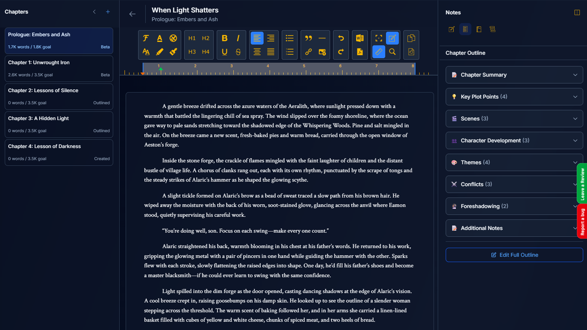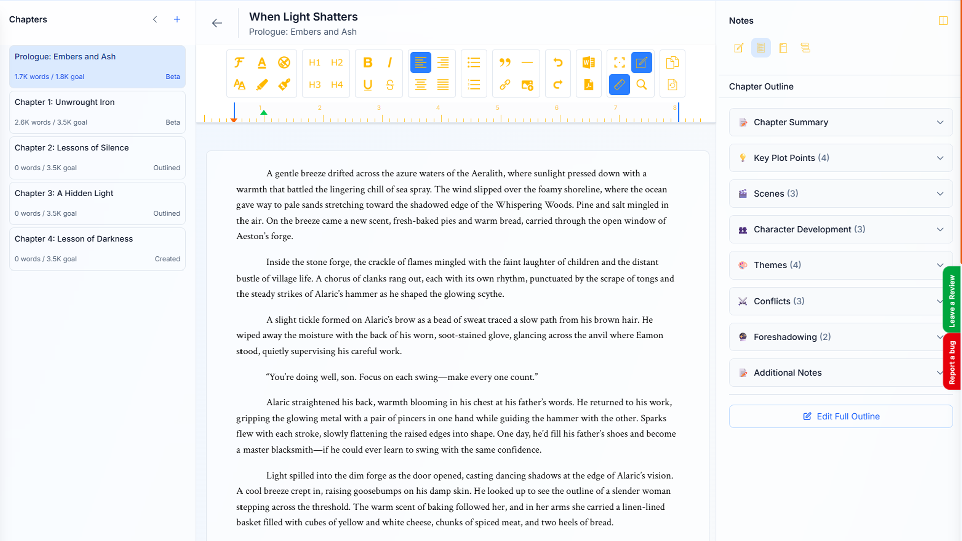 Whether you're a meticulous plotter who maps every beat or a pantser who needs just enough structure to stay on track, your outline is always accessible in the Notes Panel—right where you need it, when you need it.